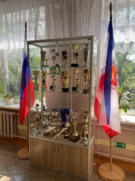 В одной из витрин размещены награды за спортивные и творческие достижения учащихся различных уровней: республиканского, всероссийского, международного (кубок за победу в Дефлимпийских играх 2007 года).