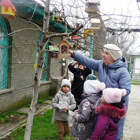Дети совместно с родителями изготовили кормушки из бросового и природного материала, а педагоги разместили их на территории дошкольного отделения. Так же мы ходим на берег моря и кормим лебедей и уток, зимующих в нашем городе. Чайки тоже без внимания не остаются.