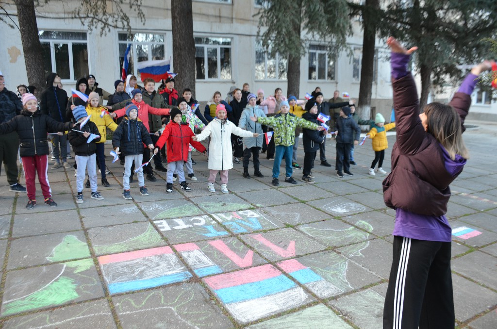 В рамках общешкольного мероприятия, приуроченного к этой важной праздничной дате, мы вначале рисовали. Ребята, вооружившись цветными мелками, приступили к работе. Старались все: от мала – до велика.